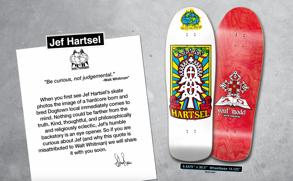 World Industries Jef Hartsel Yout Model skateboard deck blends classic 90s World Industries attitude with a deeper story behind the name. At first glance, Jef Hartsel’s skate photos give off the image of a hardcore, Dogtown-bred skater—but nothing could be further from the truth.